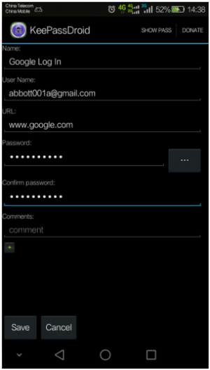Start KeePassDroid app, create password databas, type the file name, click “Create” as shown below: